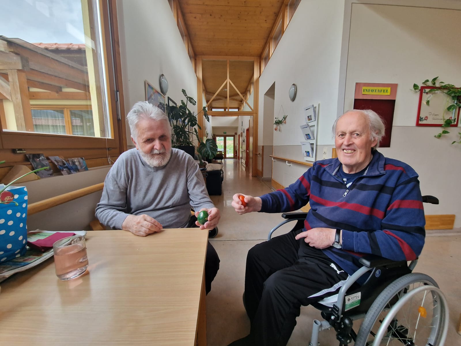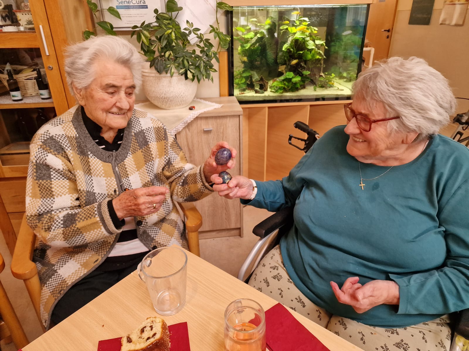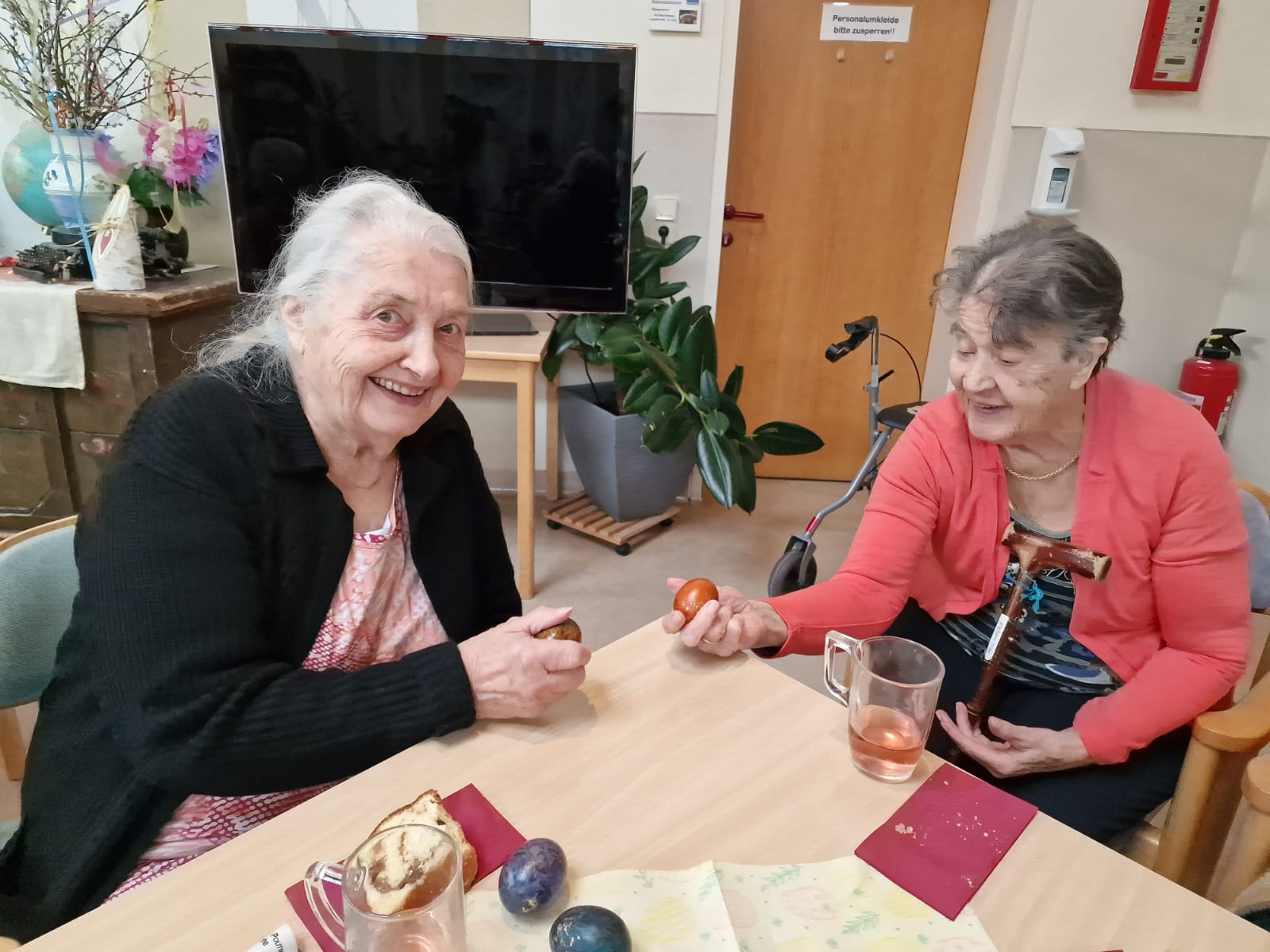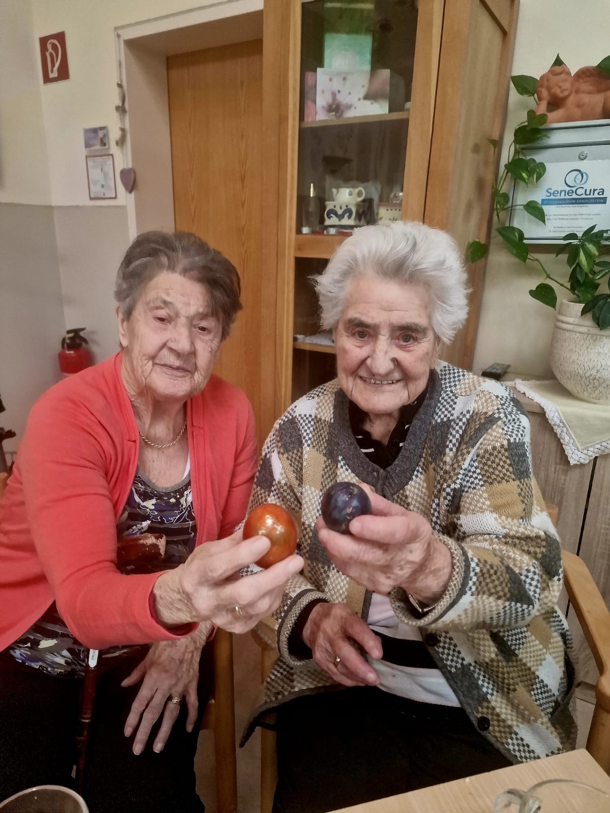 Viel Spaß hatten die Seniorinnen und Senioren des SeneCura Pflegezentrums Arnoldstein beim Eierturtschen. Das Eierturtschen ist ebenso ein alter Brauch, bei dem zwei Bewohner:innen jeweils ein Osterei aussuchen und anschließend gegeneinander antreten und die Eier aneinander schlagen. Die Person, bei dem das Ei kaputt geht, hat verloren – und wenn man gewinnt, hat man schon ein Ei mehr! Die lustige Aktivität sorgt für einiges an Spaß und alte Erinnerungen werden geweckt.