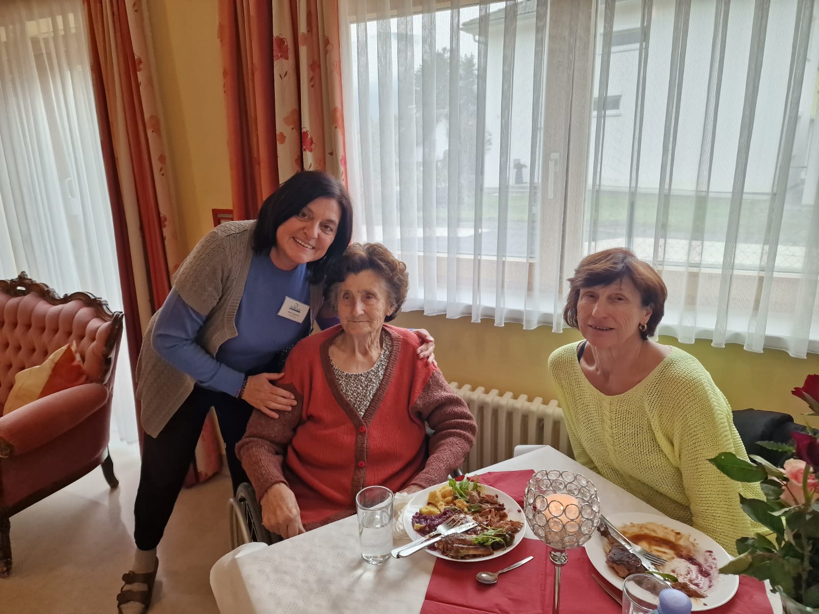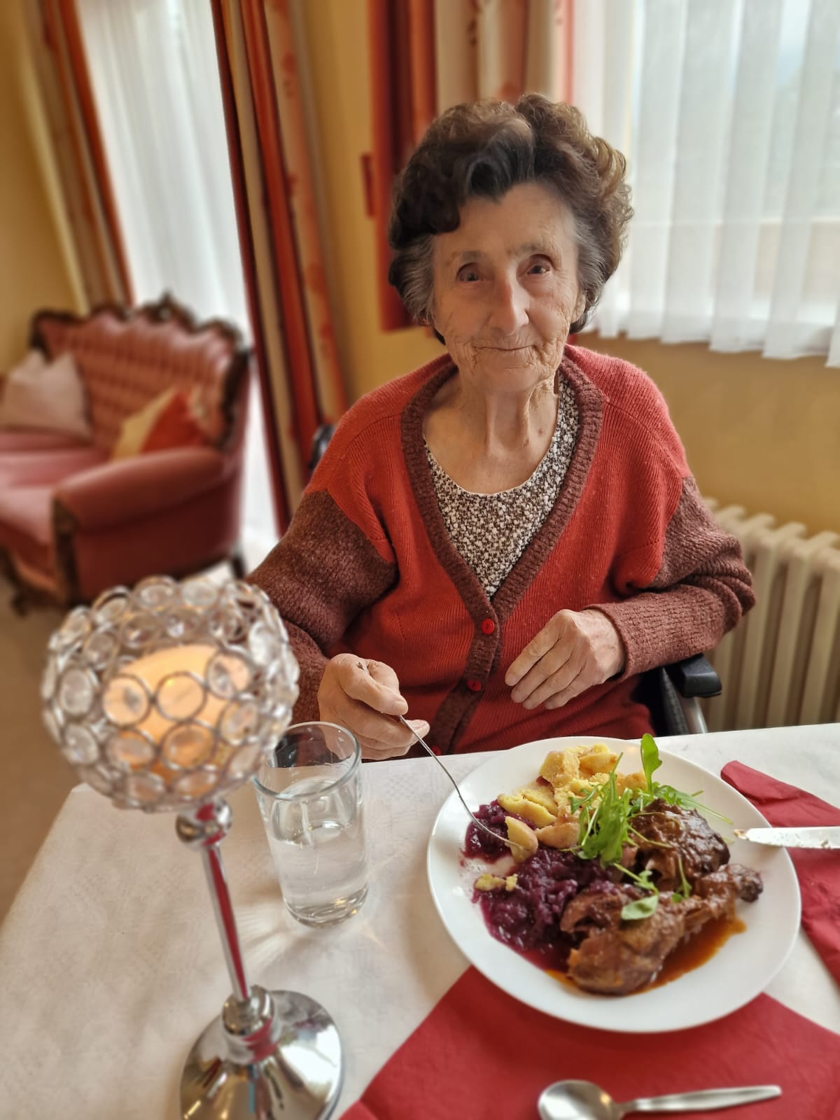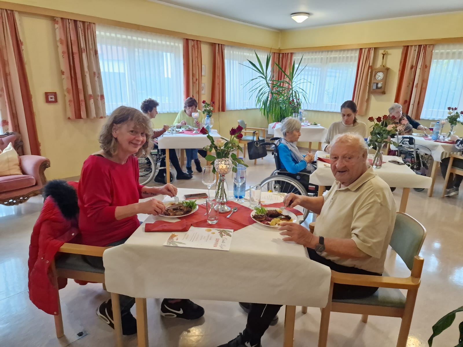 Für pflegebedürftige, ältere Menschen ist ein Restaurantbesuch meist sehr beschwerlich oder gar unmöglich. Deshalb holt SeneCura mit dem Candle Light Dinner das Haubenlokal ins Haus. Kürzlich war es im SeneCura Sozialzentrum Arnoldstein soweit. Gemeinsam mit ihren Angehörigen genossen die Bewohner:innen ein mehrgängiges Menü in schönem Ambiente. Festlich dekorierte Tische und erlesene Menükompositionen verwöhnen die Gäste und sorgten für strahlende Augen. Heuer zauberte das Küchenteam rund um Küchenleitung Herr Dali folgendes Menü: Es gab eine Kürbiscremesuppe gefolgt von einem knackigen Caesar Salat. Als Hauptgang wurden geschmorte Entenkeulen aus dem Backofen mit Knödel und Rotkraut serviert. Ein herrliches Himbeere-Tiramisu bildete den süßen Abschluss. „Der Abend war schöner, als in jedem Restaurant.“, schwärmte eine Bewohnerin abschließend. Ein stimmungsvoller Abend mit kulinarischen Genüssen, der für schöne Momente sorgte.
